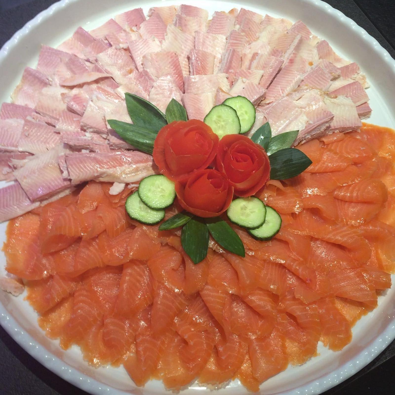 Antipasti-Spezialitäten, Räucherlachs und geräuchertes Forellenfilet