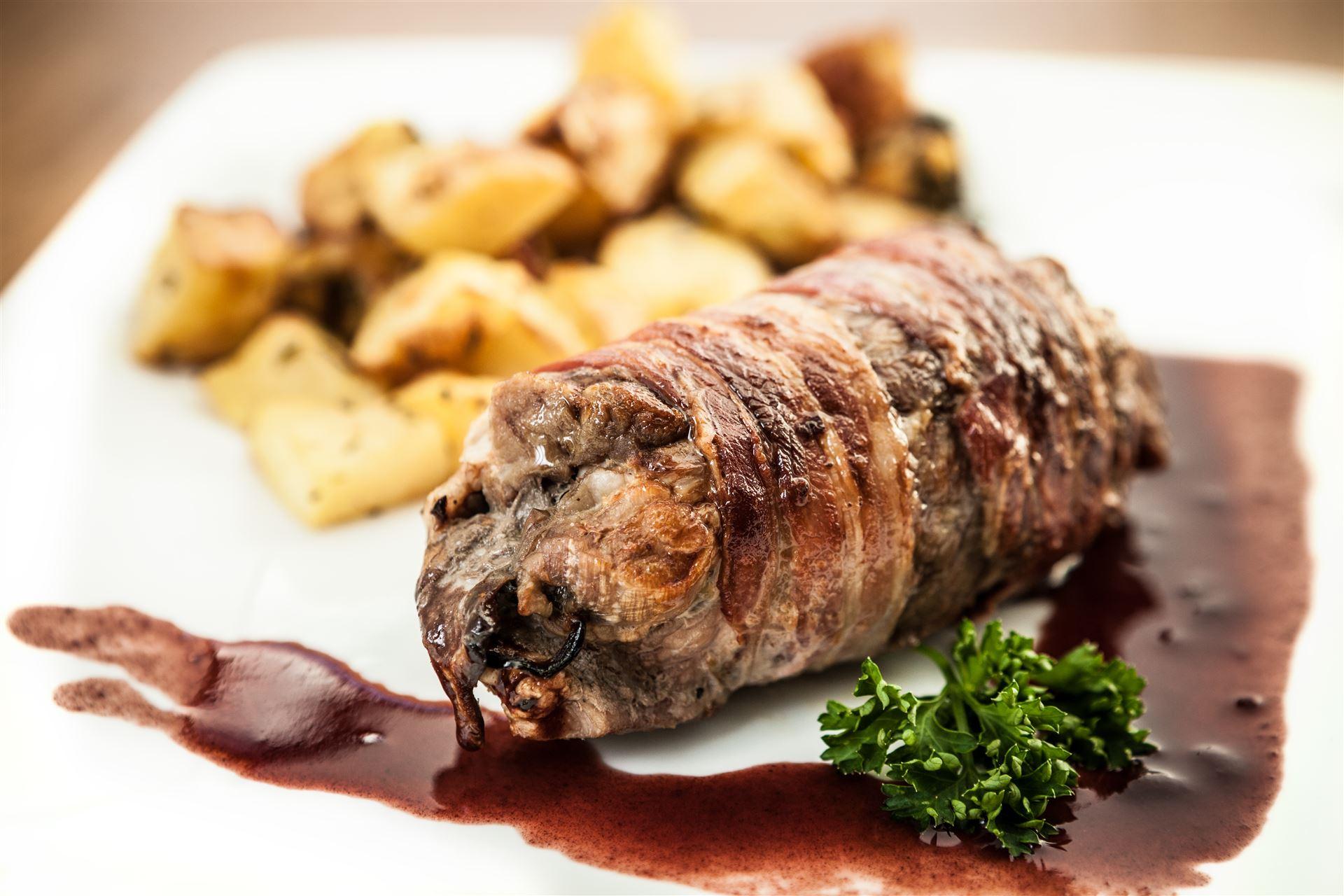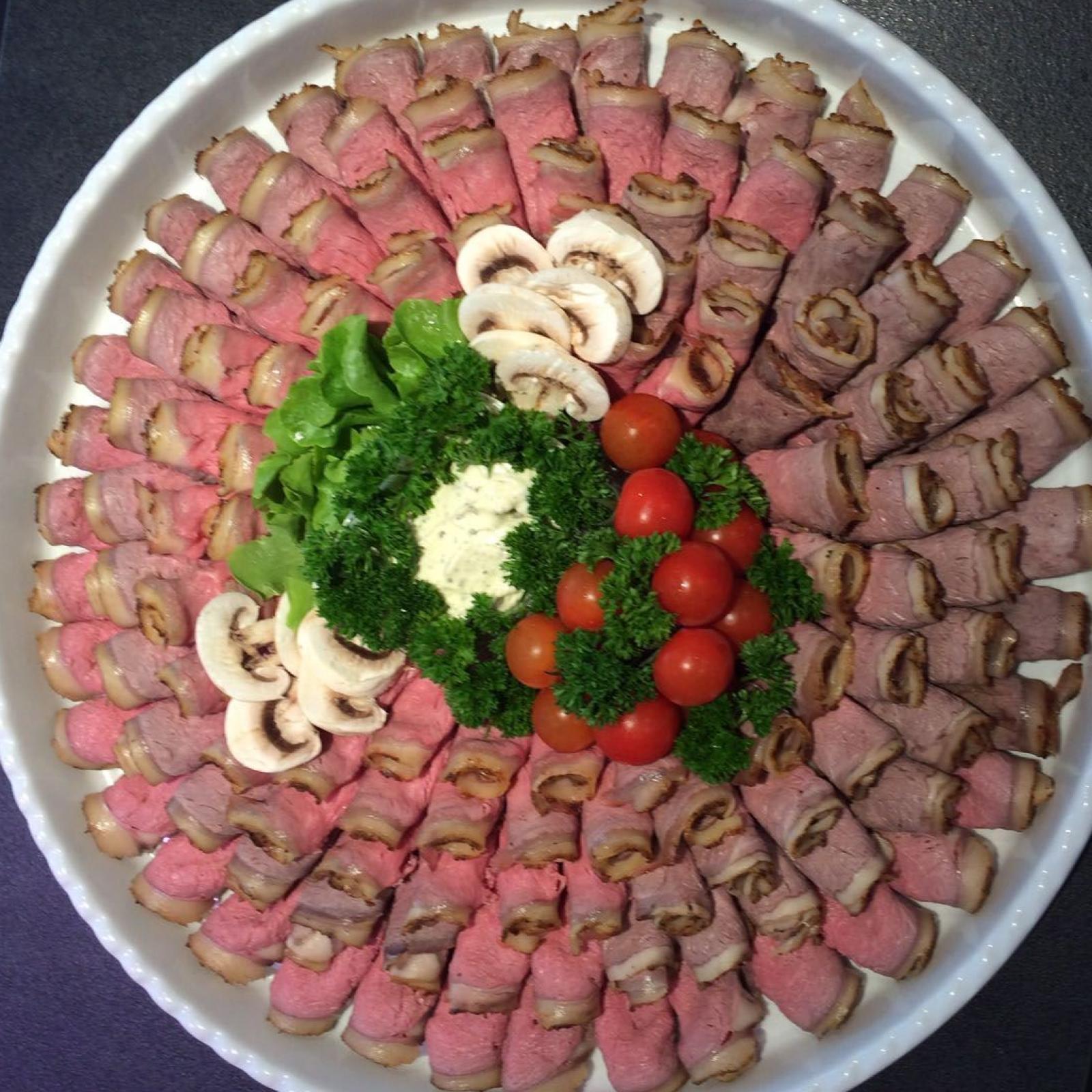 Kalbsmedaillon mit Cognacrahmsoße, Putenrollbraten gefüllt, Roastbeef am Stück gebraten,